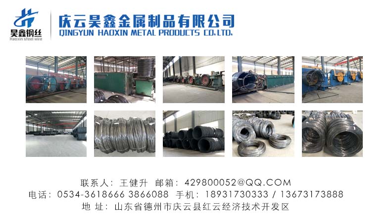 慶云昊鑫金屬制品有限公司坐落在山東省德州市慶云縣紅云經(jīng)濟技術(shù)開發(fā)區(qū),這里環(huán)境優(yōu)美、交通便利,本廠主要加工生產(chǎn)45#-70#、65Mn彈簧鋼絲、77B-82B預(yù)應(yīng)力鋼絲、30MnSi篩網(wǎng)鋼絲、Q195、Q235低碳冷撥絲等產(chǎn)品。
